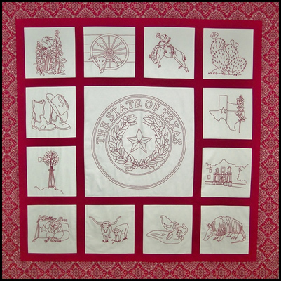 of your quilt. With sashing and borders, it measures 68" by 68". All blocks are hand-stitched with redwork embroidery, joined with solid red sashing, and finished off with a red bandana border. Some Texas quilt shops are using this one as a block-of-the-month.