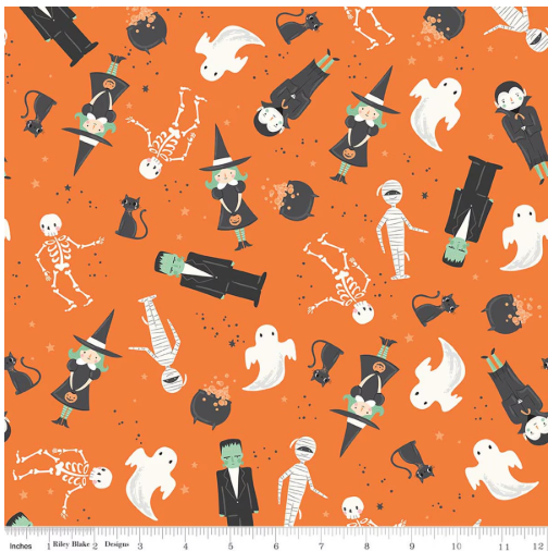 Great for quilting, apparel and home decor. This collection features whimsical Halloween characters, including ghosts, witches, skeletons, black cats, mummies, and Frankenstein.