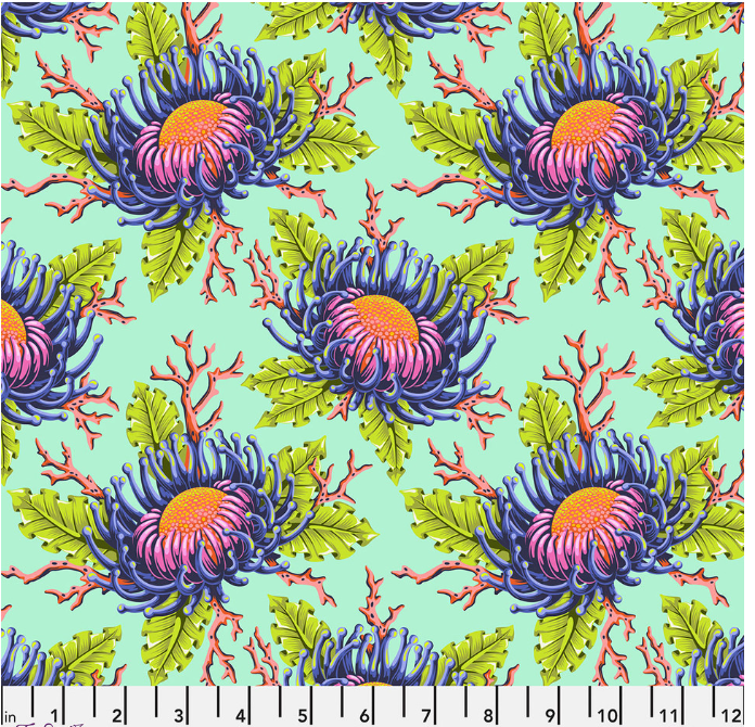 Bouquets with sprigs of coral, anemones and seaweed. Mixed among these water florals are the shadows of sharks, colorful seahorses, tropical fish and krates with the occasional octopus tentacle for good measure. Take a dip in the deep sea and let the magical underwater world wash over you.